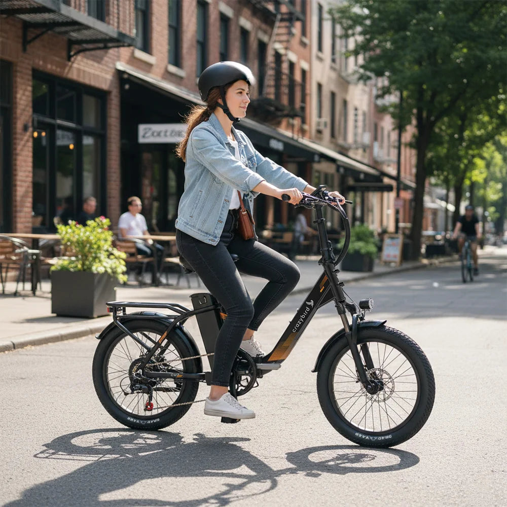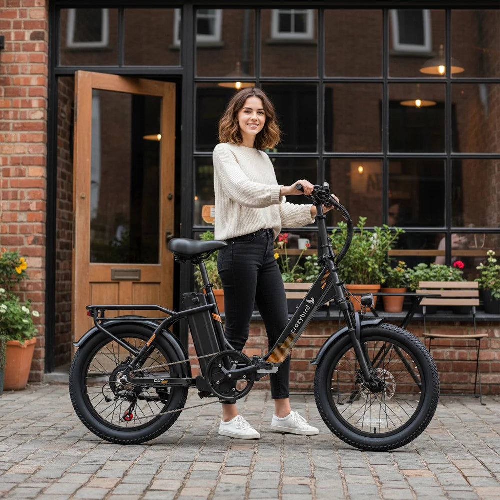 Pequeña, ágil y práctica: una bicicleta compacta es la compañera ideal, ofreciendo una flexibilidad y versatilidad excepcionales. Ya sea para desplazarse en transporte público, ir de compras por la ciudad o viajar en autocaravana, el diseño compacto de la Crazybird CU7 y sus ruedas más pequeñas permiten guardarla y transportarla ahorrando espacio.